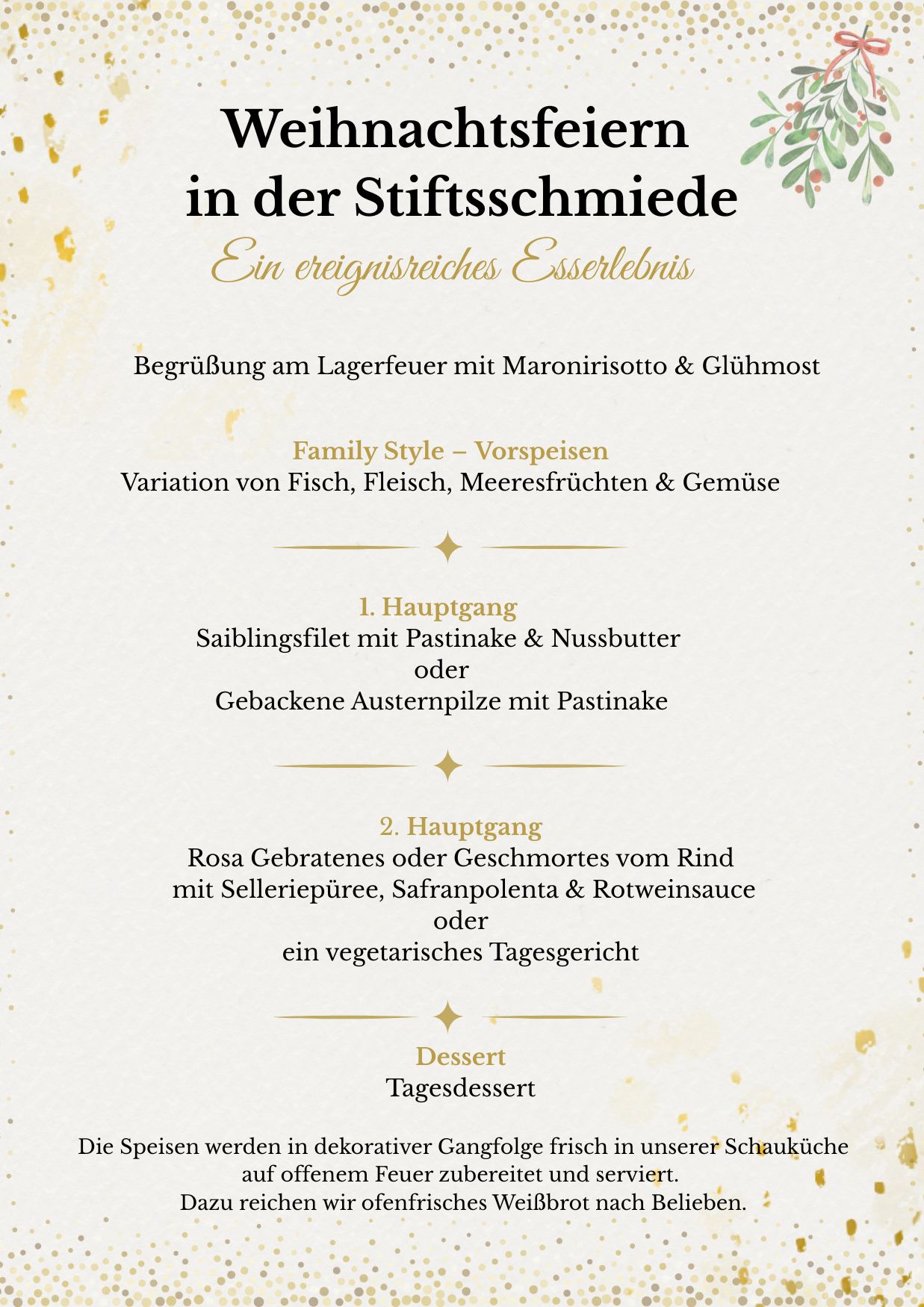 Genießen Sie Ihre Weihnachtsfeier in der besonderen Atmosphäre der historischen Stiftsschmiede ✨. Wir begrüßen Sie mit Maronirisotto und Glühmost am Lagerfeuer 🔥, bevor wir Ihnen ein festliches Menü servieren – frisch in unserer Schauküche am offenen Feuer zubereitet.